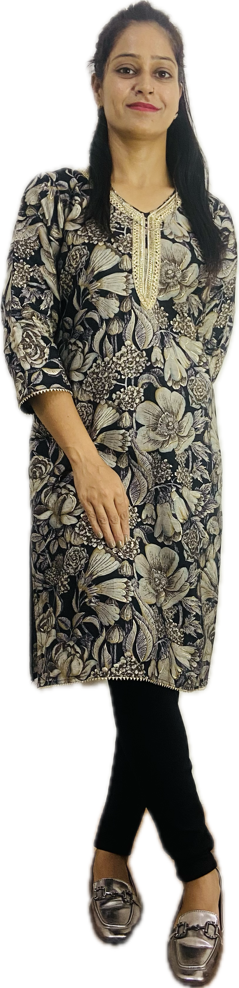 • Style:- Straight | Pattern: Floral  Print | Occasion: Casual |  | Sleeve Type: 3/4 Sleeve | Color: Black and golden